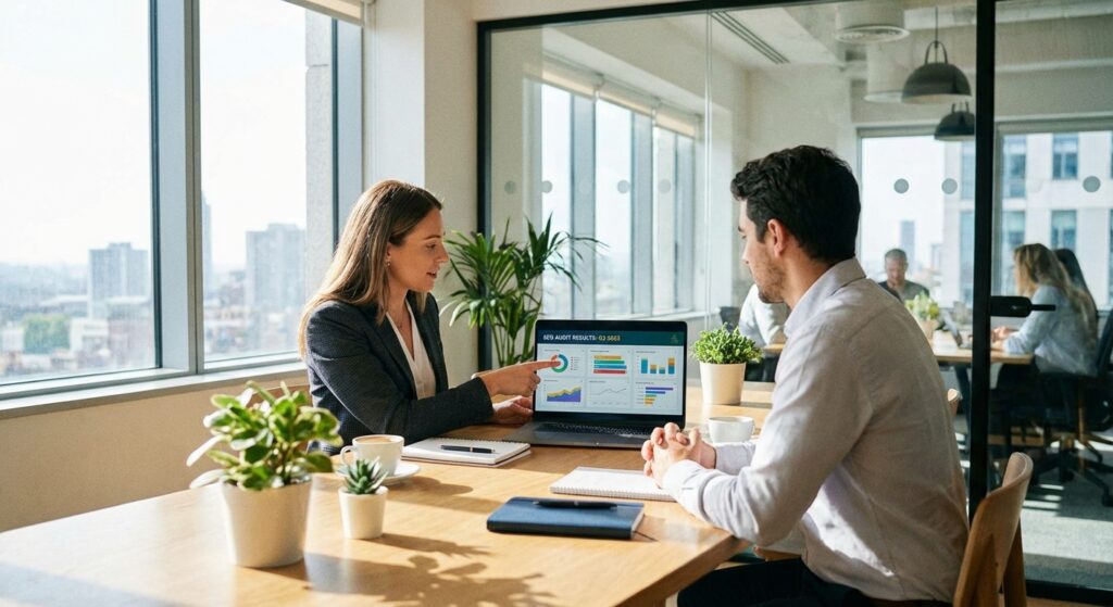 Notre accompagnement SEO couvre quatre piliers : l’audit technique (vitesse, indexation, structure), l’optimisation on-page (contenu, balises, maillage interne), le netlinking (acquisition de liens de qualité) et le suivi de performance (positions, trafic, conversions). Chaque mois, vous recevez un rapport détaillé avec les actions réalisées, les résultats obtenus et les prochaines étapes. Nous assurons aussi une veille concurrentielle pour adapter la stratégie en continu. Tout est transparent, vous savez exactement ce que nous faisons et pourquoi.